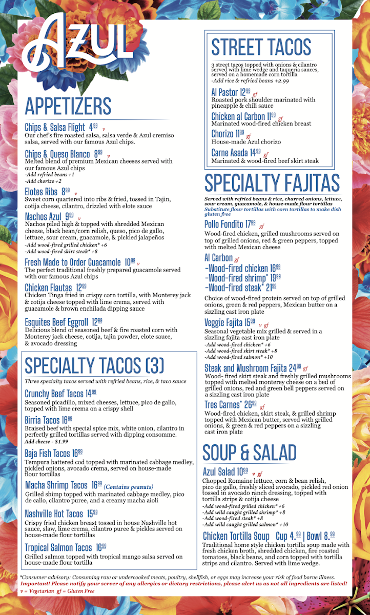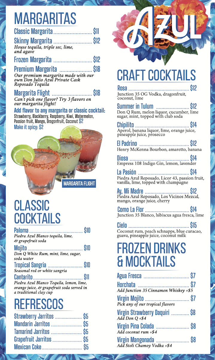 Introducing the menu at Azul Cantina, where upscale Mexican cuisine meets a warm and inviting atmosphere. Located in the heart of Pigeon Forge, TN, this vibrant restaurant promises an unforgettable culinary experience. Guests rave about the exceptional service that accompanies every meal, making it perfect for both large gatherings and intimate dinners.